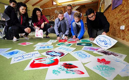 Initiiert hat das der Moerser Künstler Rüdiger Eichholtz. Unterstützend schreitet er durch die Tischreihen im Klassenzimmer, immer helfend, wo er Bedarf sieht. Die Schüler sollen mithilfe einer Drucktechnik verschiedene Oberflächenstrukturen abbilden und miteinander vermischen. Es sollen hier keine perfekten Bilder entstehen, macht Eichholtz klar. Das Ganze sei mehr ein kreatives Experiment. "Bei dem Wort ,Kunst' fallen Kindern gerne schon mal die Kinnladen herunter", erzählt Eichholtz. "Hierbei geht es aber mehr um das ,einfach mal machen'."
